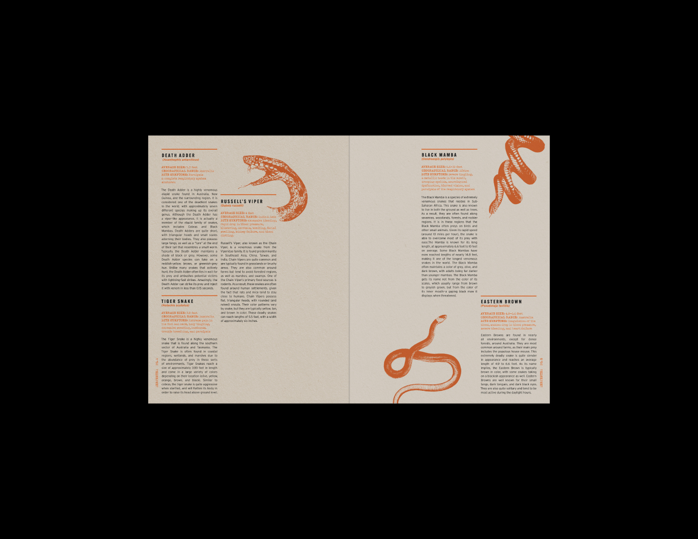 Serpentes is a series of field guides focusing on the overview of snakes, deadly species, as well as the mythology of snakes through the exploration of different grid systems